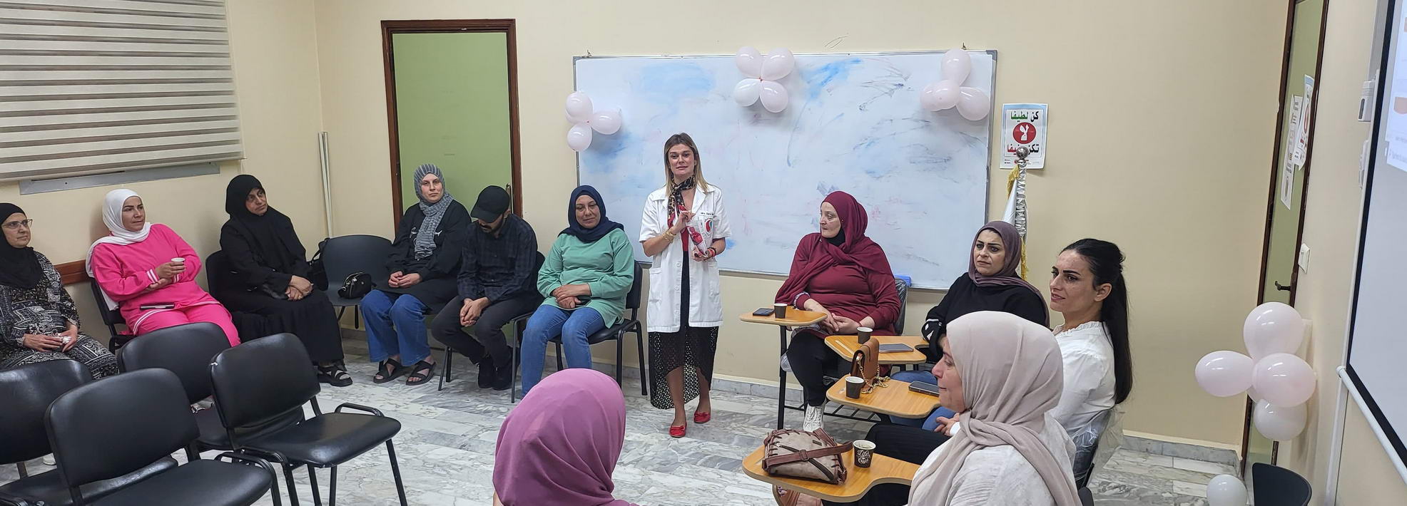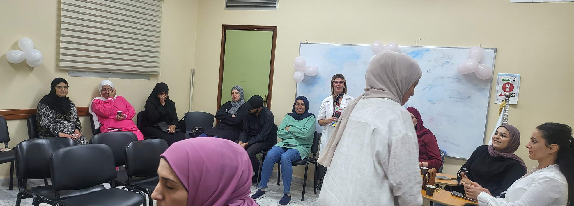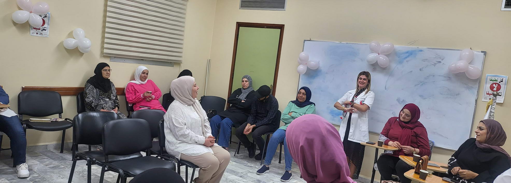 الورشة إستمرت خمسة أيام وتمحورت حول مواضيع الثقة بالنفس , الصحة الإنجابية, تطوير الذات والتفكير الإيجابي, وحاورت فيها مديرة التمريض في المستشفى السيدة سارة سلوم والقابلة القانونية في المستشفى السيدة آمنة غملوش والمرشدة الإجتماعية فرح حمود.